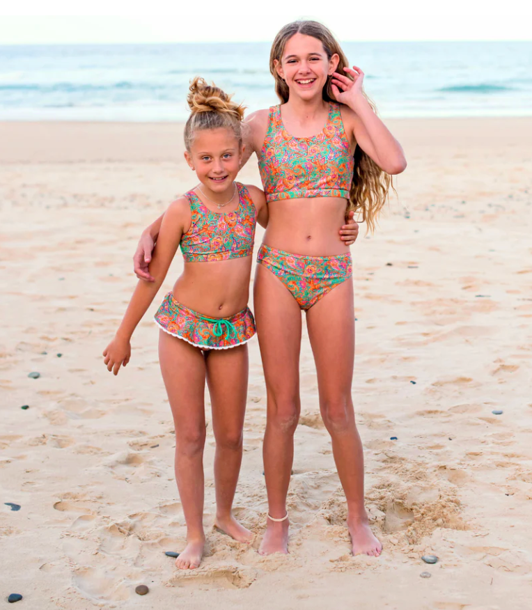 Finally girls swimwear from Australia that is perfect for their age! Introducing the tween bikini--perfect for fun beach days! Featuring a choice of bottoms with playful frills or plain brief bottoms, our designs adds a touch of charm while providing extra top length and bottom coverage for comfort and confidence. Additionally it is designed with stylish yet modest cuts, it ensures your teen can enjoy the sun and surf with ease. Embrace the perfect blend of fashion and function with our thoughtfully crafted tween bikini! If you're looking for the best girls swimwear. Designed for active girls, this swimsuit features a secure yet flexible fit, allowing unrestricted movement while swimming, surfing, or playing in the sand. With chlorine-resistant, fade-proof fabric, it’s built to last, making it a must-have for summer adventures. Whether at the beach or by the pool, our girls swimwear Australia collection ensures style, durability, and confidence in every splash!