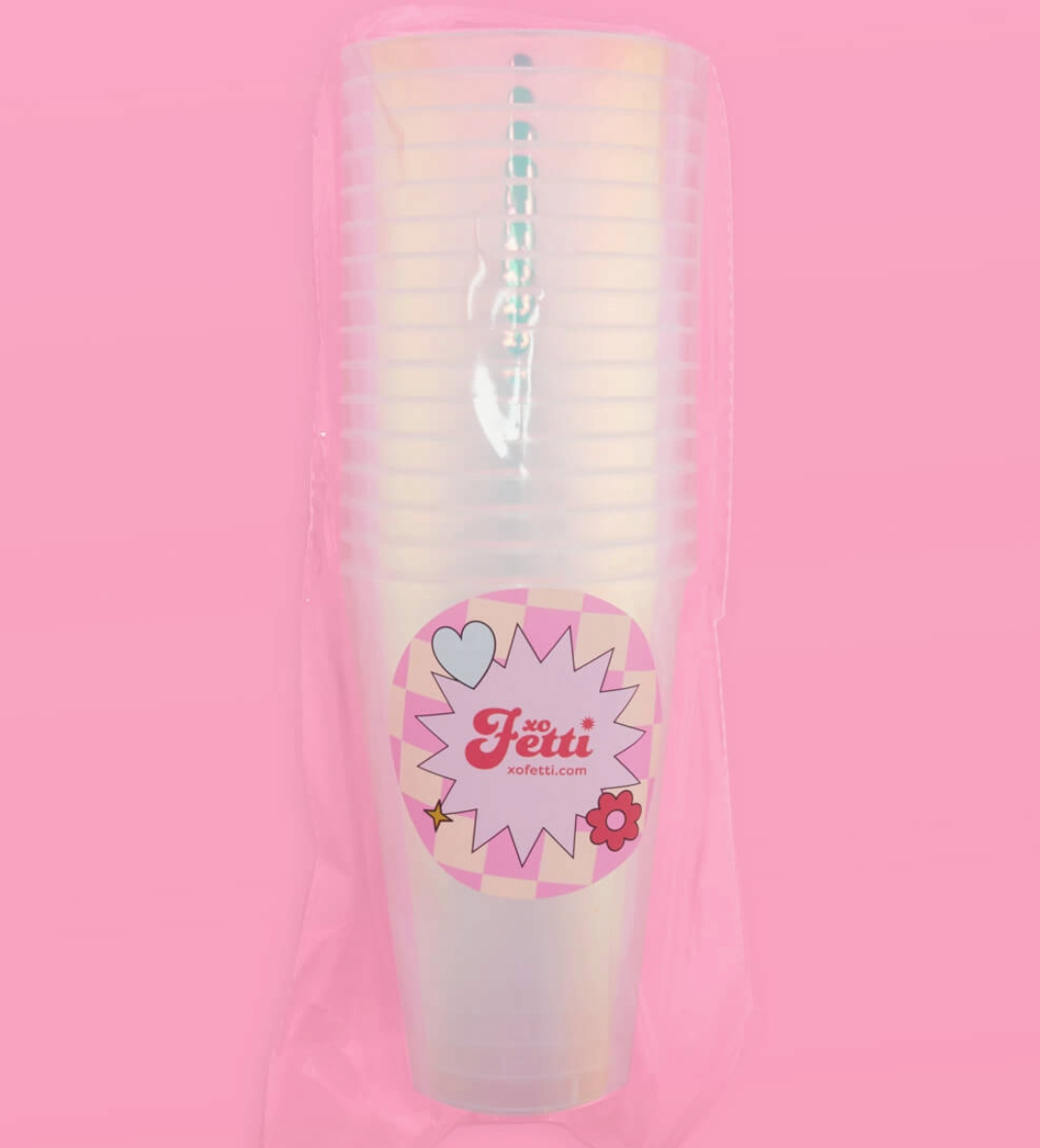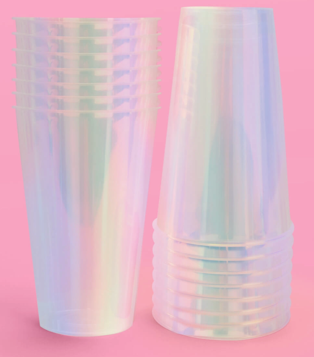 Shine bright like a diamond. Celebrate with these versatile iridescent cups by xo, Fetti. Fits 16oz of your favorite bev! 16 disposable cups per order. Made of shiny iridescent plastic + perfect for any party.
