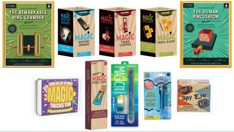 Magic Tricks by US Toy Company: Magic Mystery Drawer, Magic Finger Chopper and Magic Pencil Sucker.