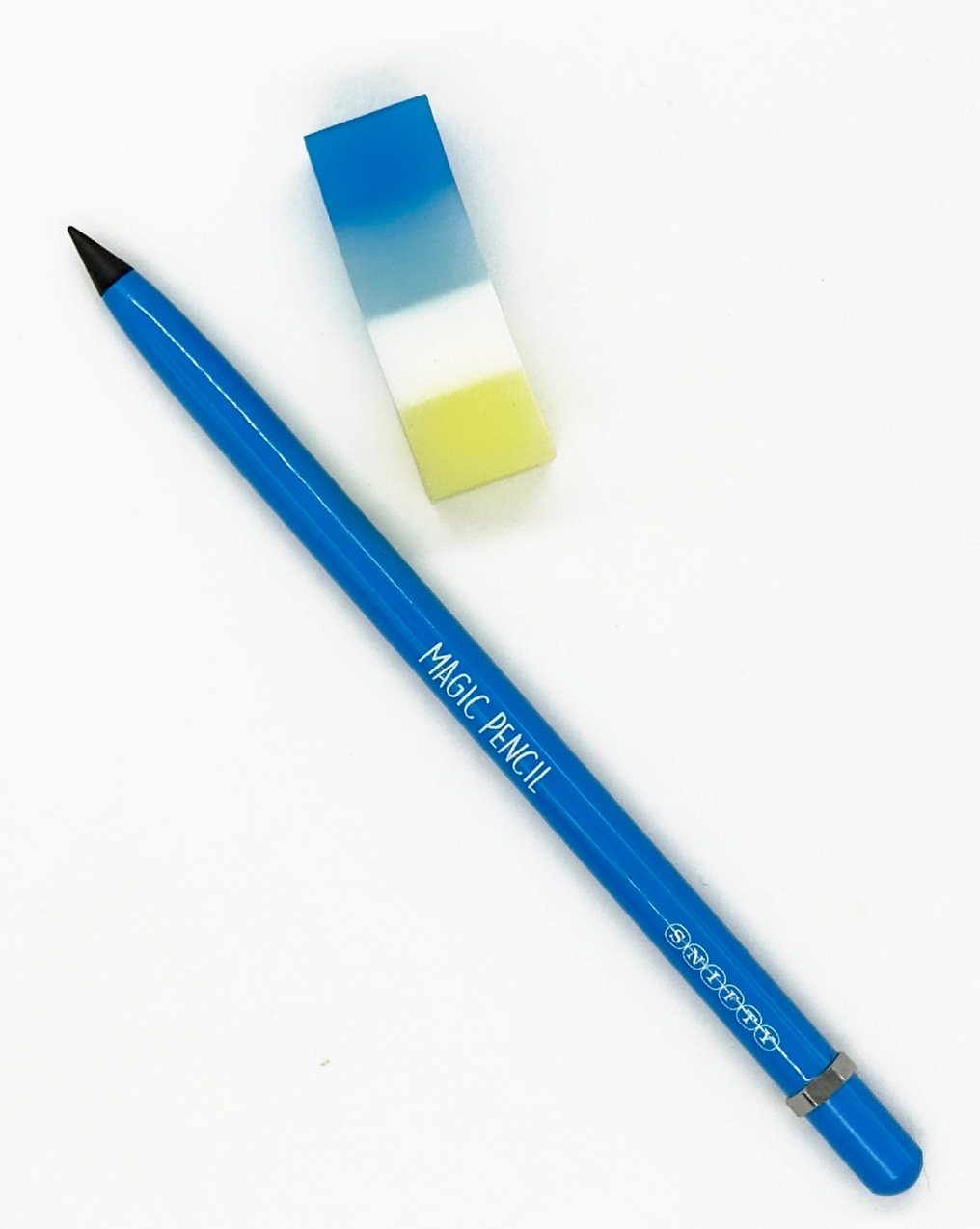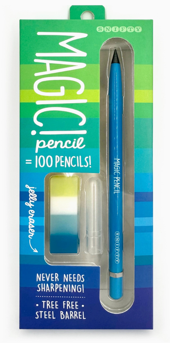 Magic Pencil by SNIFTY: The MAGIC PENCIL never needs sharpening! Its compressed graphite tip equals 100 regular pencils, so you can keep on writing, and writing, and writing, and writing, and writing, and writing, and writing.... Beautifully packaged with a chunky matching eraser and protective cap. Super strong steel barrel. Tree-free & earth-friendly! Blue barrel, blue, white and yellow eraser.