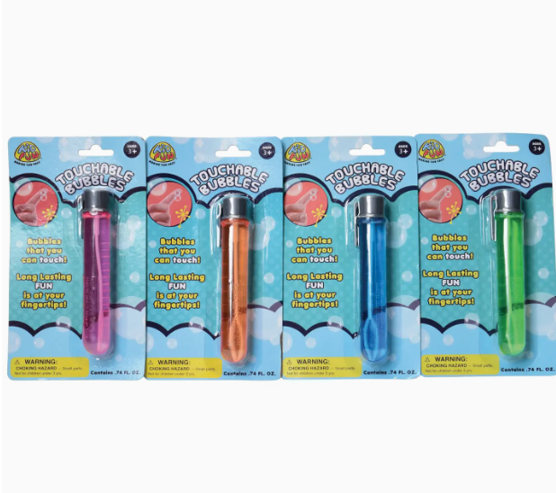 Touchable Bubbles by US Toy Company: Long lasting fun is at your finger tip with bubbles you can touch. Long lasting fun is at your fingertips with bubbles you can touch. Bubble wand is attached to cap Assorted colors Not for consumption Made of plastic and bubble solution.
