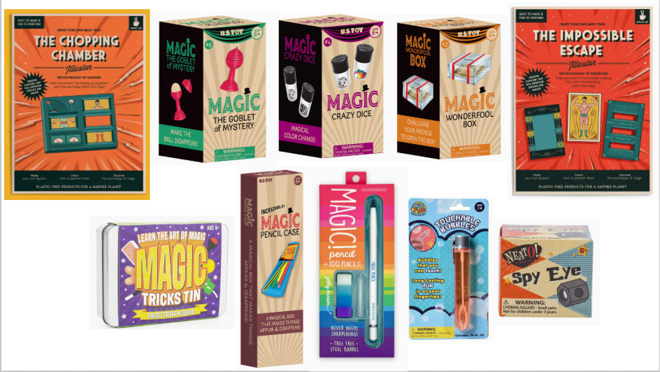 Magic Tricks by US Toy Company: An assortment of inspiring magic tricks. Tricks included are the Wonderfool Box, Crazy Dice and The Goblet Mystery.