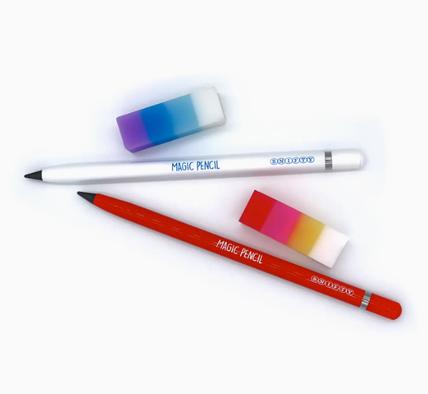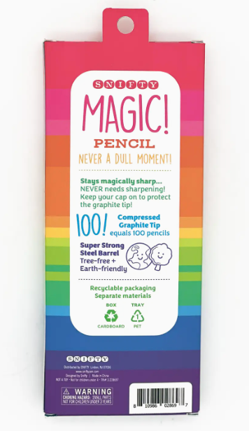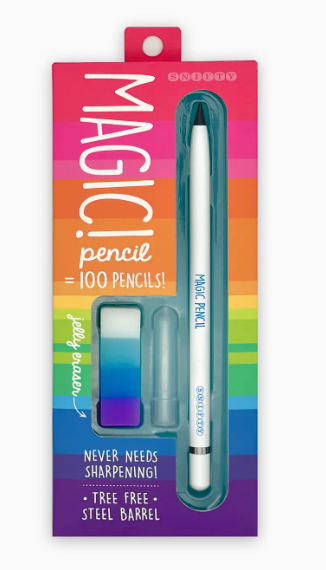 Magic Pencil by SNIFTY: The MAGIC PENCIL never needs sharpening! Its compressed graphite tip equals 100 regular pencils, so you can keep on writing, and writing, and writing, and writing, and writing, and writing, and writing.... Beautifully packaged with a chunky matching eraser and protective cap. Super strong steel barrel. Tree-free & earth-friendly! White barrel, blue and purple eraser.