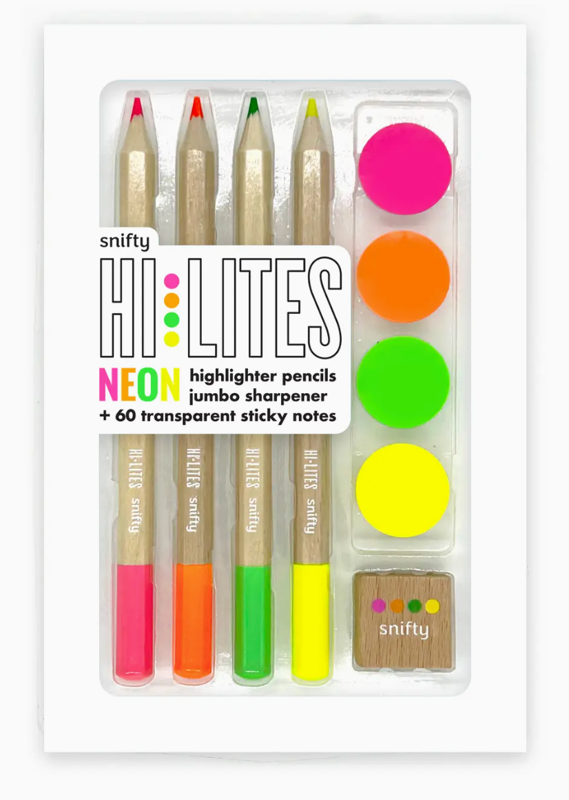 Hi-Lights Neon Pencil Highlighting Set by SNIFTY: What a bright set! 4 neon highlighter pencils, jumbo dual sharpener and transparent, tear proof sticky notes in 4 colors … Snifty has everything you need for stylish ink free highlighting!