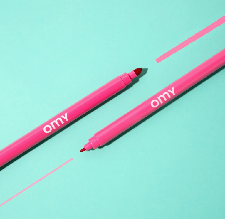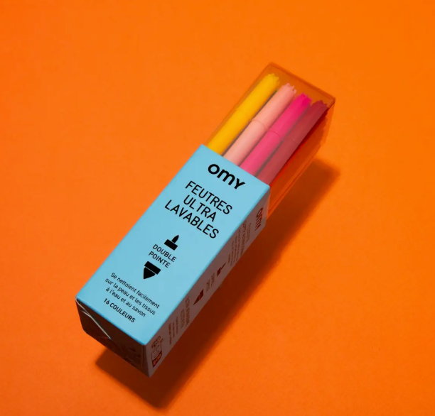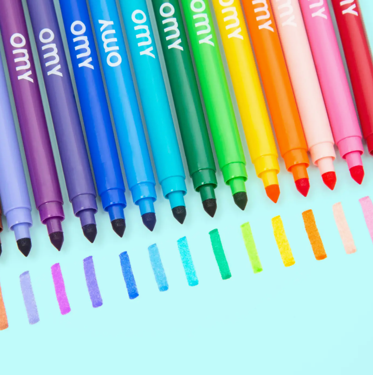 Ultra-washable Markers by OMY: 16 bright vivid colors with no mess felt tips! The ink can easily be removed from skin and textiles with the help of a little soap and water! Double tipped, one end is thick and the other is thin. Little ones can be messy, but clean-up is easy with ink that washes clean.