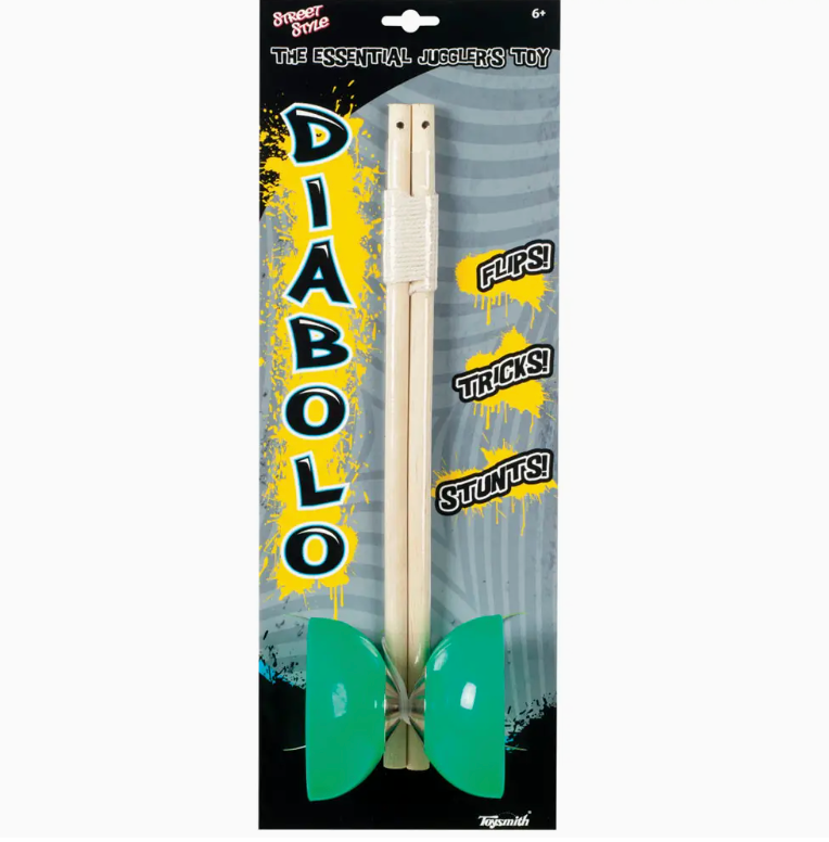 Anti Gravity Diablo Juggling Set by Toysmith: Whirl and toss the spinning 4-inch spool on the string with this anti-gravity toy from Toysmith. The Street Style Diablo set includes a colored plastic spool that can be used to perform tons of fun tricks and stunts by simply flying it up and around on the 14.5-inch string. Spool comes in green, red, blue, or yellow. Best used outside, this toy is a top seller.