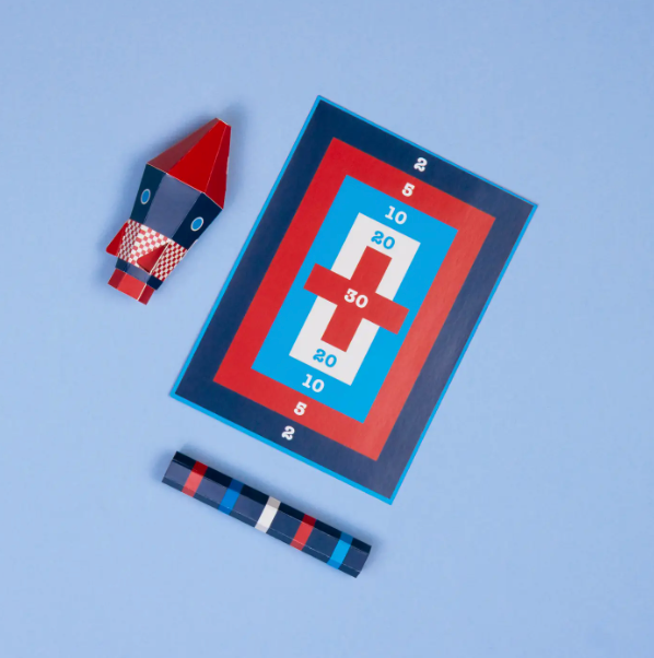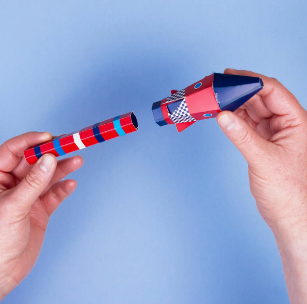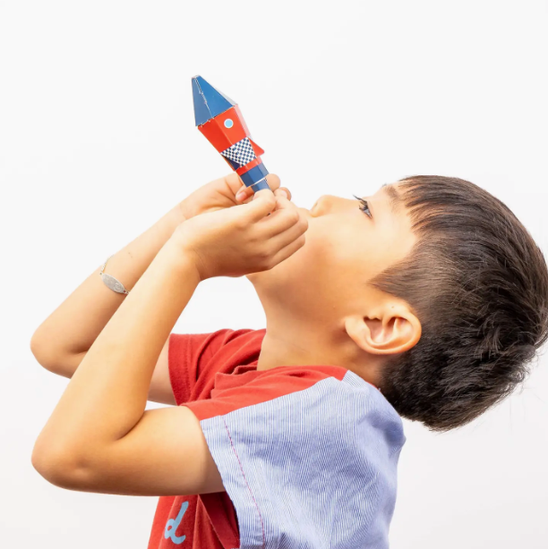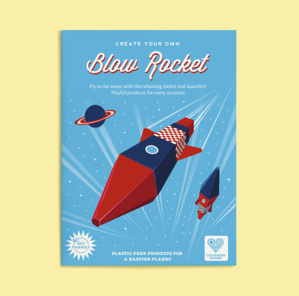 Blow Rocket by Clockwork Soldier USA: Fly to the moon with this whizzing rocket and launcher! Playful products for every occasion. Build and launch your own reversible blow rocket. Send your rocket into space and win points by returning it to the landing pad. Full of space jokes and facts with no glue or scissors needed. Plastic-free products for a happier planet.