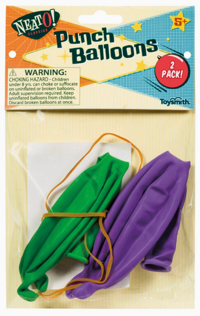 Punch Balloons by Neato!: Includes 2 latex balloons in 2 different solid colors. Each punch balloon is connected to a looped elastic band that stretches and easily fits all finger sizes. Balloons are made of latex and can expand up to 16 inches. Inflation nozzle is not included.