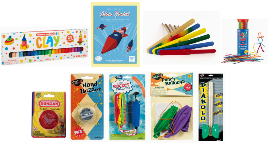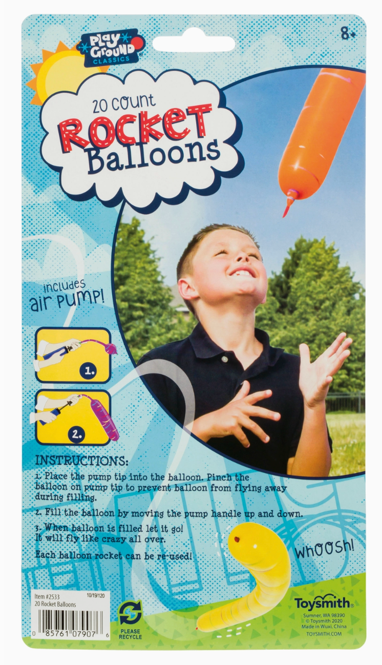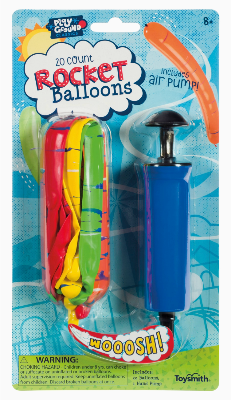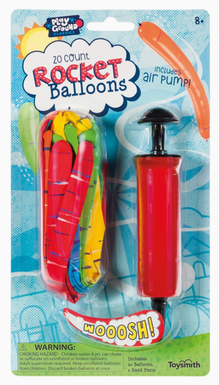 Rocket Ballons by Toysmith: Launch a colorful flying rocket with this 20-count rocket balloon set from Playground Classics. Each peggable blister packet includes 20 latex balloons and one 7-inch plastic air pump. Balloons are brightly colored with multicolored striped designs. Colors vary but may include red, orange, green, yellow, and blue. The two-way hand pump is easy to use for inflating balloons. Simply inflate the balloon on the pump, then let it go and watch it zoom away. Balloons can inflate as large as 40 inches and are shaped like rounded tubes.