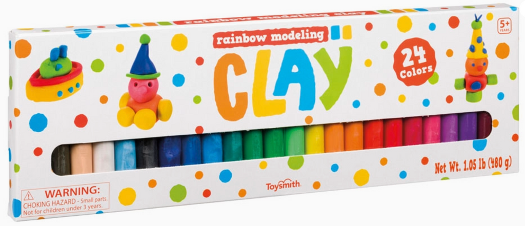 Rainbow Clay by Toysmith: Designed for little artists, the Toysmith Rainbow Modeling Clay set includes 13 colored clays. The plastic tub is resealable for easy storage or transport. Colors include white, light pink, hot pink, red, orange, yellow, green, turquoise, light blue, dark blue, purple, and black. Each clay roll is solid in color and helps kids create magnificent 3D structures. This incredible, high-quality clay material is unique in that it won’t harden. Kids can play with each clay color for hours, and it won’t dry out or break!