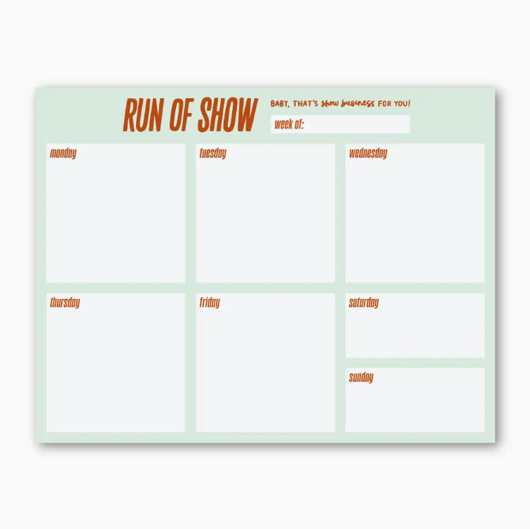 Run of Show Weekly Notepad by Kyn You Believe It: Plan your week like a true headliner. With plenty of space to organize your schedule, this large-format weekly notepad keeps all your moments front and center (on stage and off). if you could see it IRL: Approximately 50 single-sided sheets, 8.5 x 11 inches