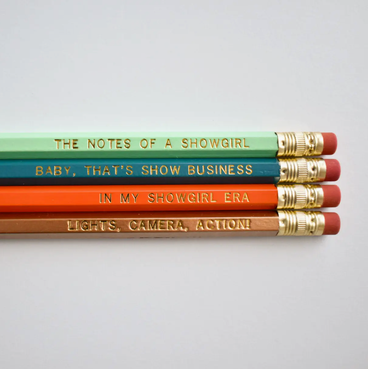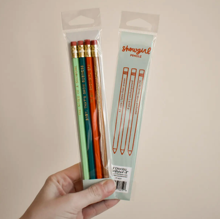 Showgirl Pencil Pack by Kyn you Believe It: Put some sparkle in your scribbles with this set of show-stopping pencils. Perfect for jotting down ideas and practicing your autograph, these pencils are sure to add some flair to your pencil cup. Pack of 4 unsharpened pencils with gold stamping, #2 core and latex free eraser, standard length (7.5 inches)