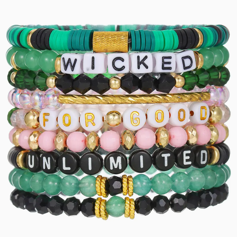 For Good Wicked Bracelet Stack by Sparkling extras: Add a touch of spooky style with the Wicked Beaded Bracelet 9 piece Set.This set features two adjustable bracelets adorned with colorful beads and fun, witchy-themed charms. Perfect for layering or gifting, these bracelets are lightweight, durable, and a stylish accessory for fans of playful and wicked designs.