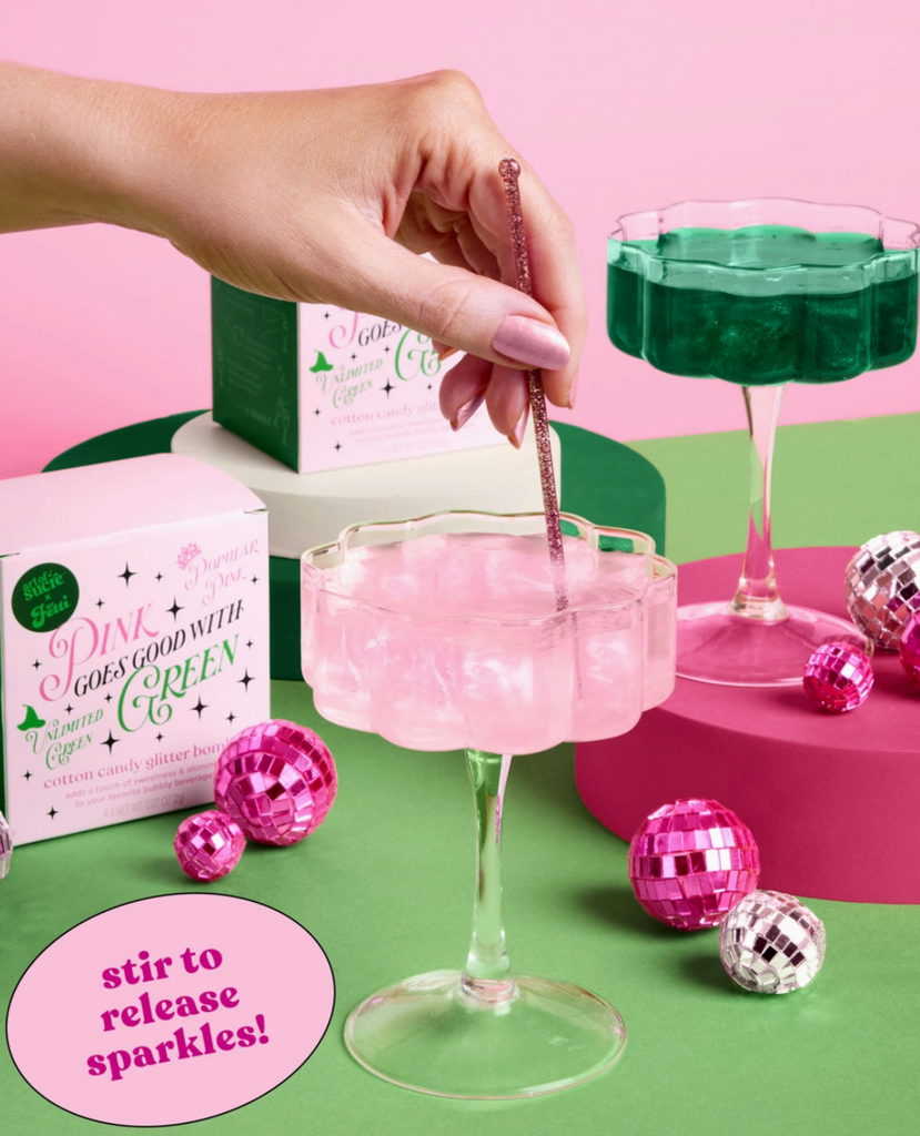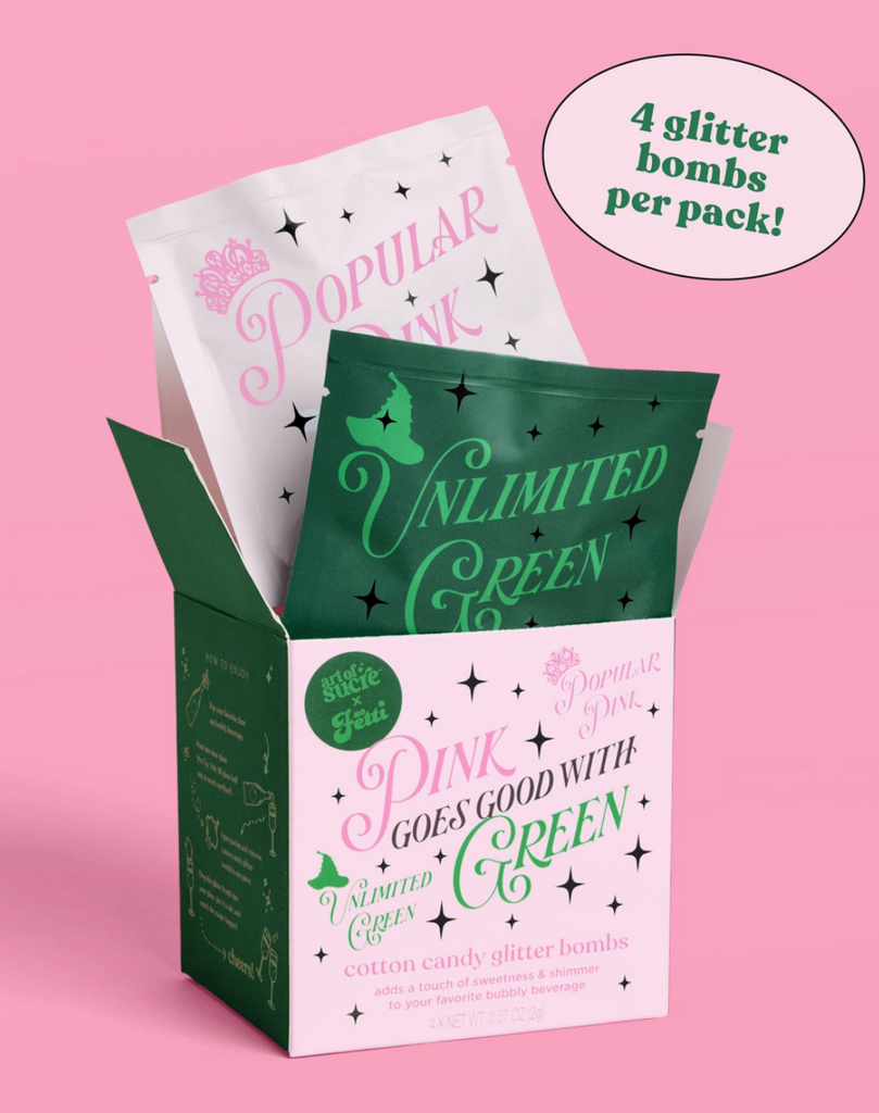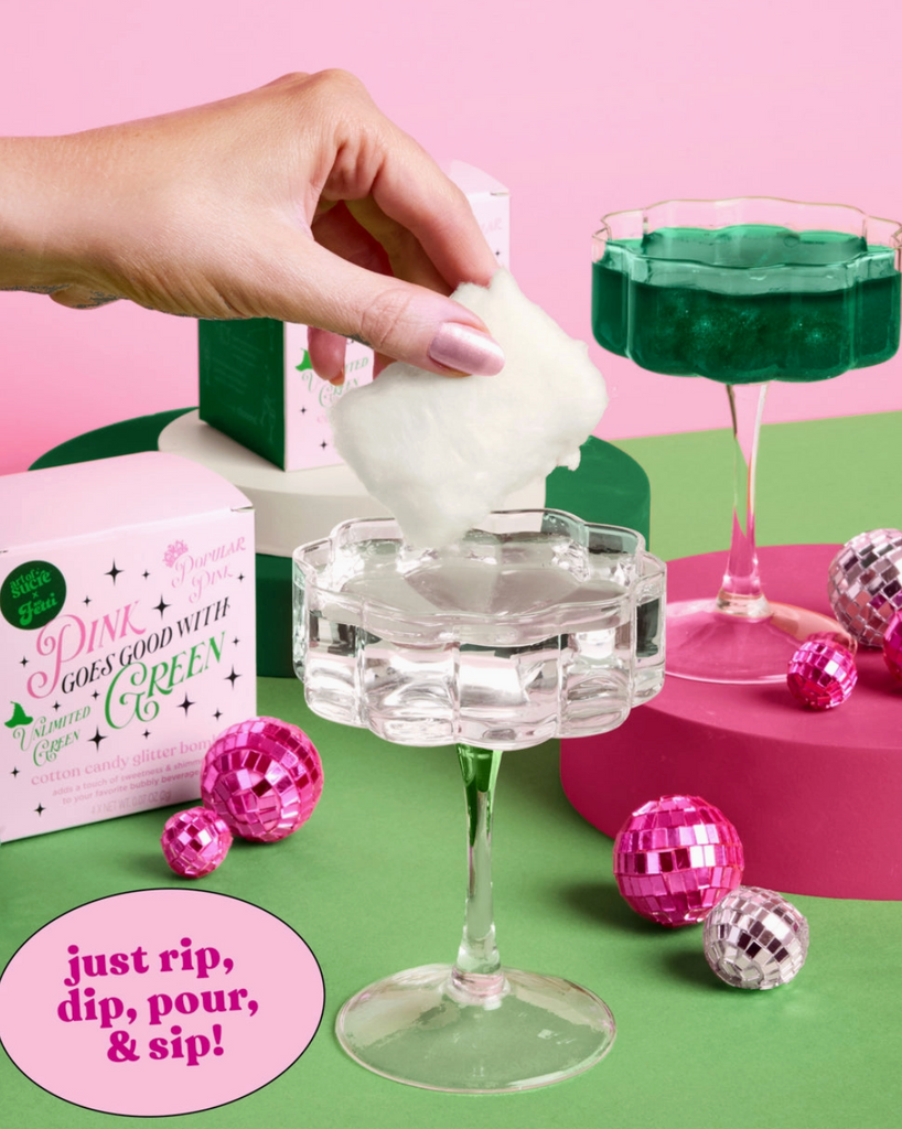 Wicked Glitter Bombs by xo, Fetti: Four cotton candy glitter bombs, two colors. No flavor but the cotton candy will add some sugar + sweetness to your drink! Easy to use; rip, drop, pour & sip! I'll tell you about popular! We teamed up with our friends at Art of Sucre to create the brightest and sparkliest cocktail accessory we could think of. This pack of four cotton candy glitter bombs will add some instant glitter + shine to your favorite bev.