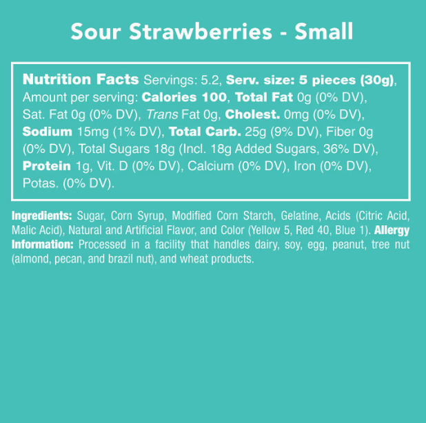 Sour Strawberries: Fresh strawberry taste dusted with a mouth puckering sour sugar — first they're sour, then they're sweet. These sour strawberry gummies are sure to become a household candy favorite! Gluten-Free.