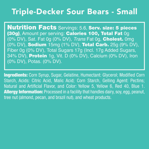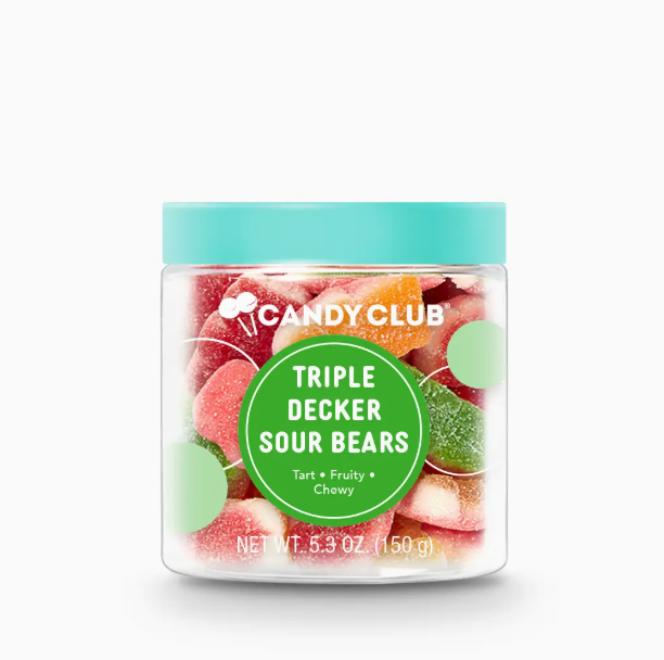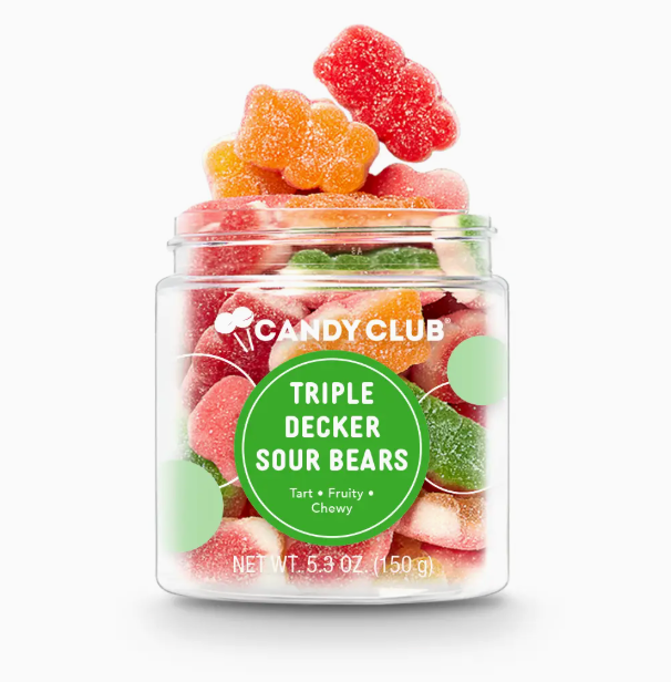 Triple Decker Sour Bears: With three layers of multicolored fruit flavor and a head-to-toe dusting of sour sugar, these sweet-tart candies provide triple the taste sensation of everyday gummy bears!