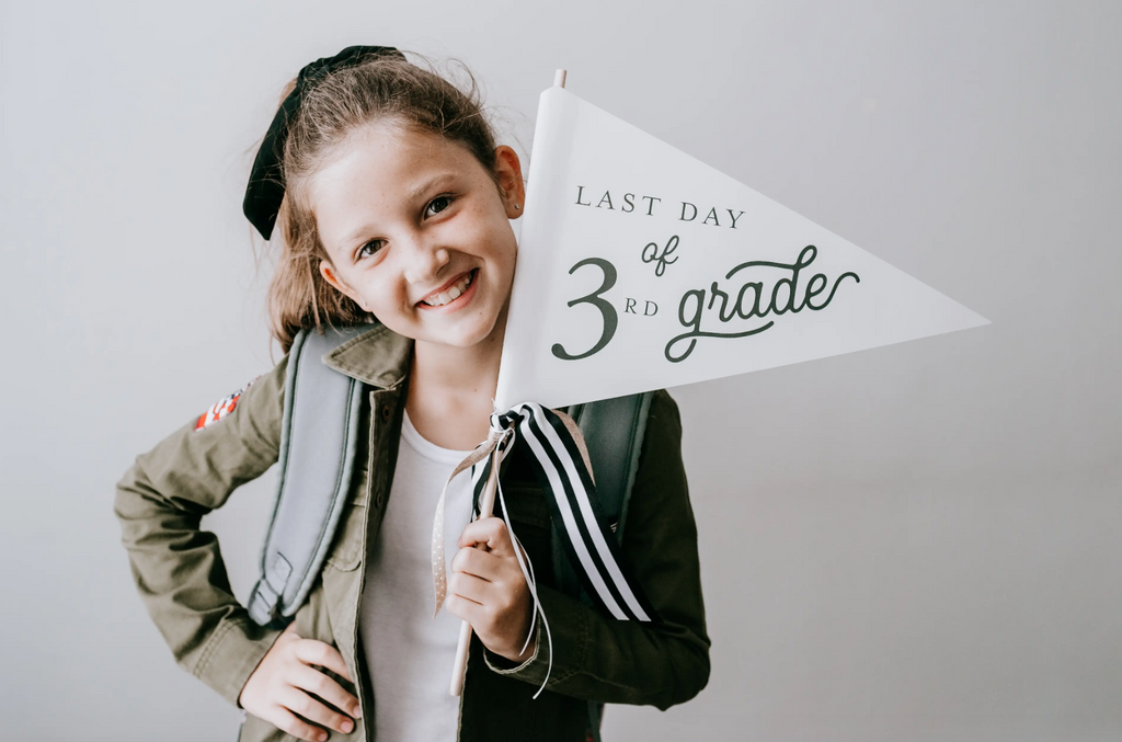 Modern back to school pennants by Ting Stationery announce the last day of school in a big way!