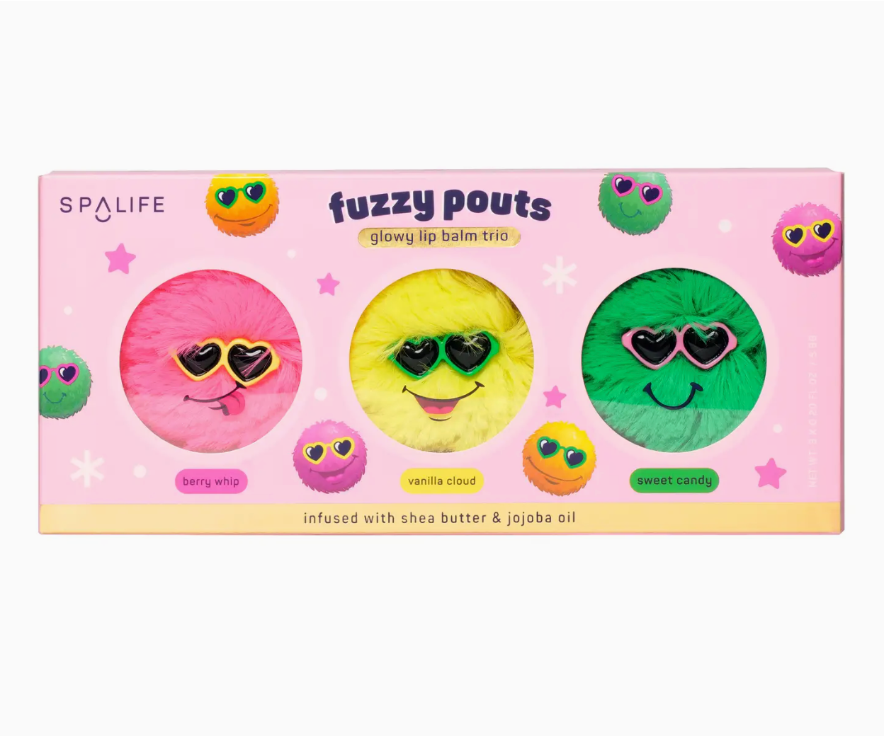 Fuzzy Pouts Glowy Lip Balm Trio by My Spa Life: For hydrated lips and shine on-the-go reach for these cute and fuzzy lip balms! Infused with ultra-moisturizing jojoba oil and she butter to help soften dry lips and deliver a natural glow!