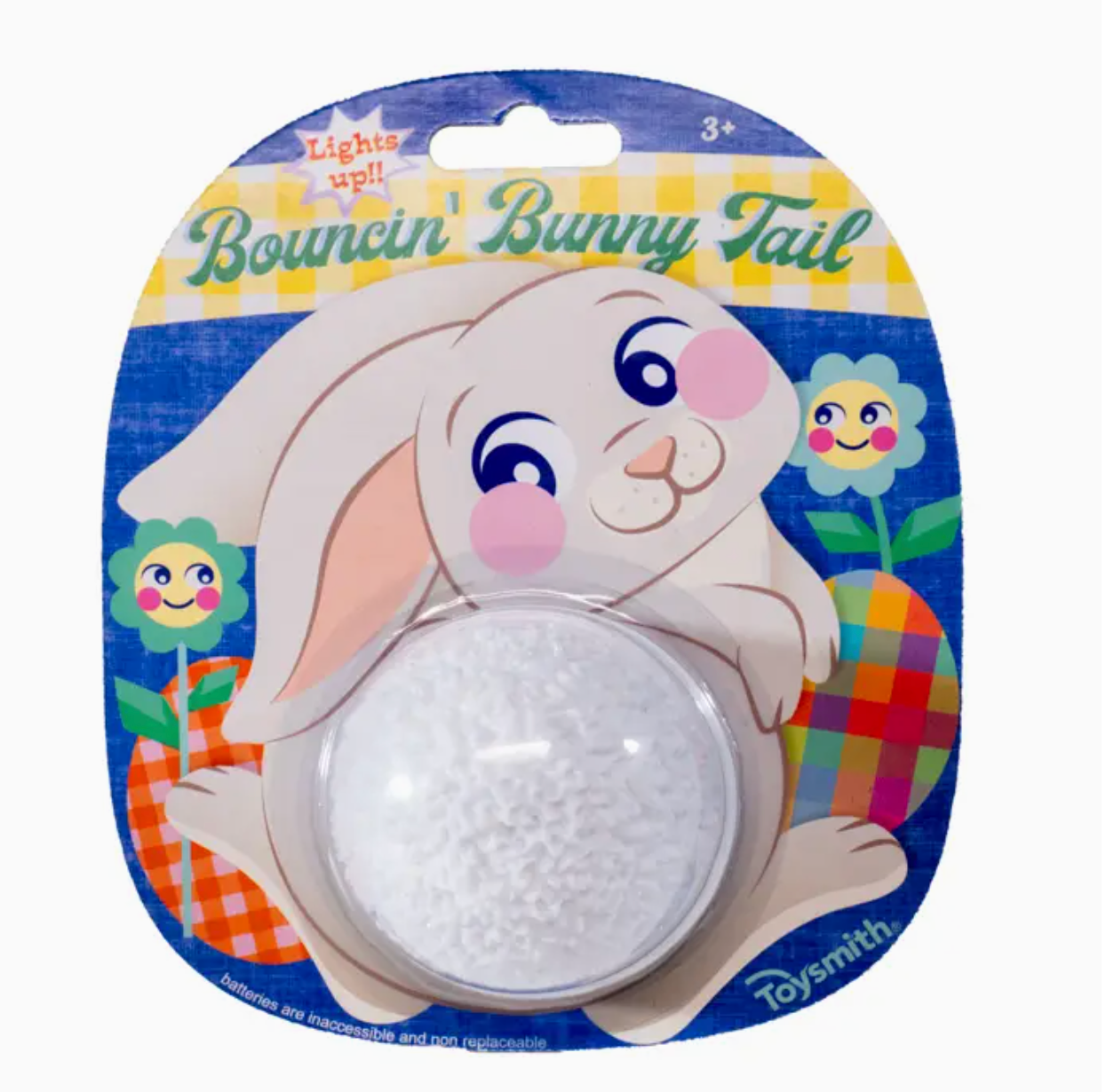 Light Up Bunny Tail by Toysmith: Bounce into Easter fun with the Light-Up Bunny Tail Ball! Bring some bounce to your Easter celebrations with this textured, white bouncy ball that lights up with every hop, making it the perfect toy for playful springtime fun. Watch the ball glow with every bounce! The internal lights add an extra sparkle to outdoor play, making it fun day or night. Shaped and textured like a fluffy bunny tail, this ball brings a cute Easter twist to the classic bouncy ball. Add this glowing bouncy ball to your Easter baskets or use it as a prize for egg hunts and party games. Age Grade: 3+ • Batteries Required.