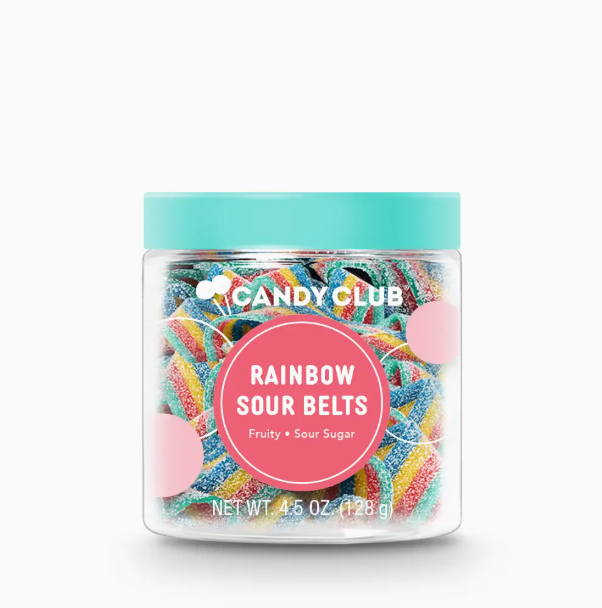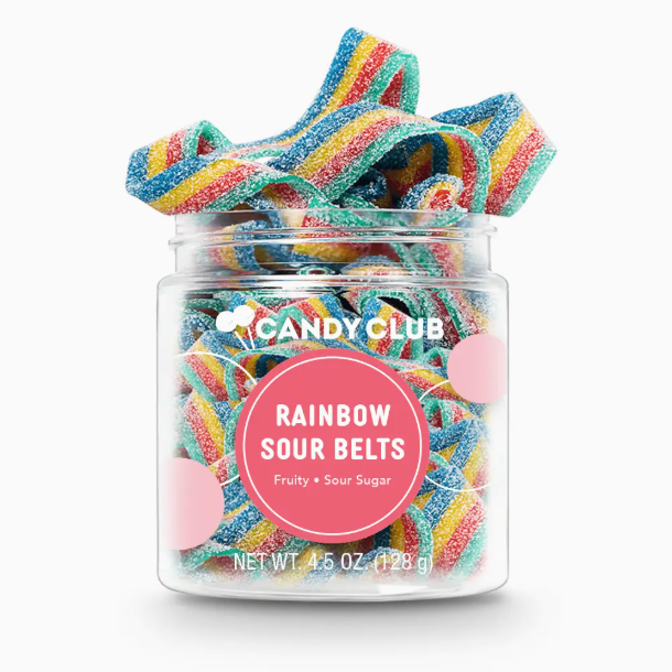 Rainbow Sour Belts by Candy Club: Catch a ride on the tail end of a sweet and sour rainbow! These delicious and mouth-puckering multi-colored strips are a candy that makes everything better. Candy Club's top-selling Rainbow Sour Belts are known to disappear quickly, so be sure to stock up! Vegan friendly.