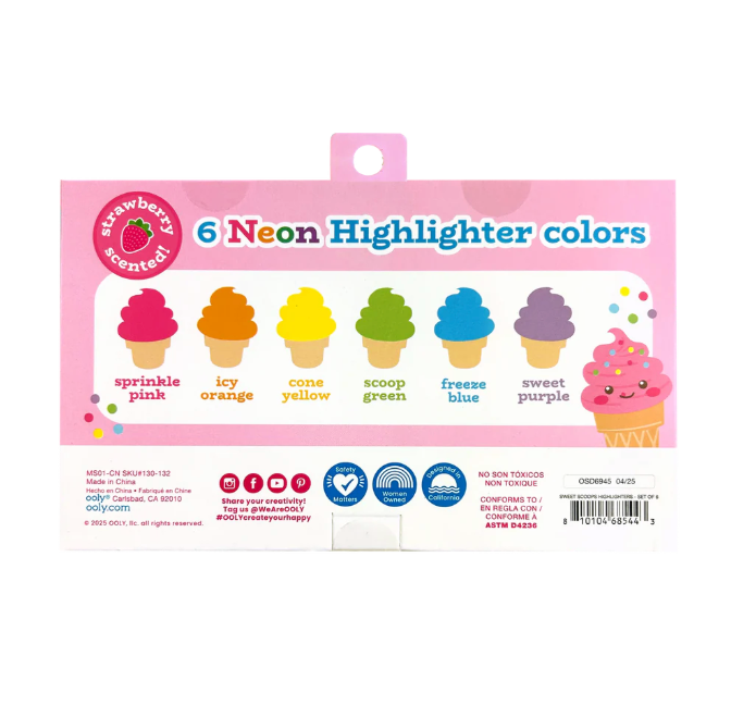 Sweet Scoops Scented Neon Highlighters by OOLY: Cute Highlighters Shaped Like Mini Ice Cream Cones! Make studying and note-taking extra sweet with the Sweet Scoops Scented Neon Highlighters! This set of 6 cute highlighters features a fun mini ice cream-shaped design, making them an irresistible addition to any collection. With neon ink, these mini highlighters add a vibrant touch to notes, planners, and artwork.