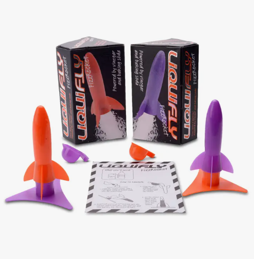FizzRocket by Heebie Jeebies: This mini rocket can be launched again and again with the explosive power of bicarb and vinegar. The Fizz Rocket is filled with these two household items which create a chemical reaction that makes a build-up of carbon dioxide which shoots out the base of the rocket and shoots the rocket up. Simply put 1 small scoop (included) full of bicarb soda into the rocket base, add a large scoop (included) of vinegar into the base, clip the rocket onto the base then place it on the group and wait for lift-off! Suitable for outdoor use only. Dimensions on stand: 10.5cm tall x 7.5cm wide. Colors include purple and orange (chosen at random). Contains small parts, adult supervision required for children under 14 years of age.