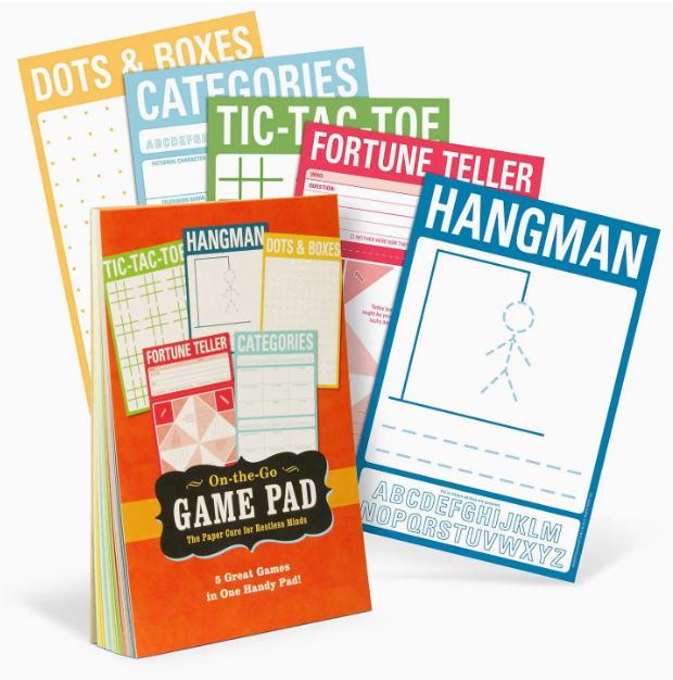 On-The-Go Game Pad by Hachette Book Group: No matter your years, sometimes you just need a little game to keep you occupied till the bus arrives or the movie starts. Packed with five classic activities for young and old alike, the On-the-Go Game Pad is the battery-free, all-paper antidote to boredom and ennui. All you add is the pencil. Ideal for rainy days, road trips, or routine restlessness Bet you forgot how great Hangman is! 60 perforated sheets; 5 games with instructions, 12 sheets each; ages 7+