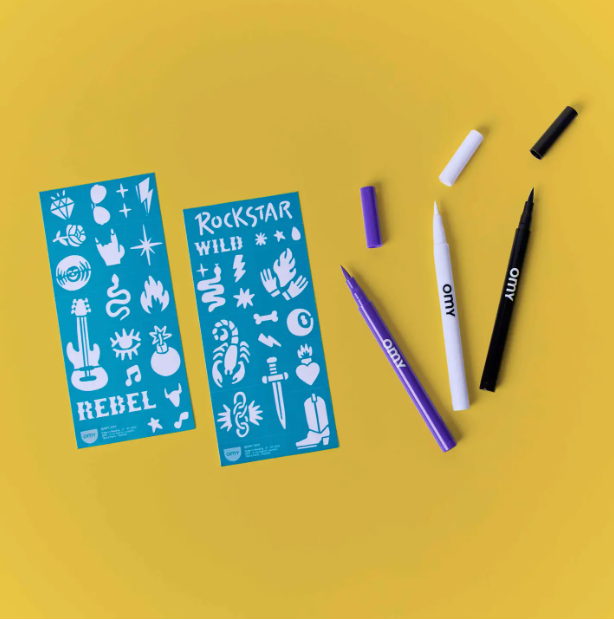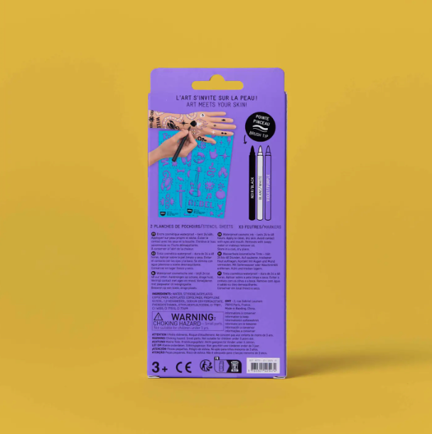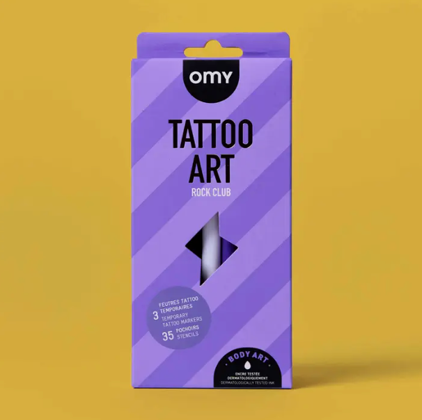 Tattoo Art by OMY: Ink markers and stencils tattoos kit by OMY. Express your creativity with these markers specially designed for the skin. Their ink dries quickly and lasts up to 2 days without smudging. The brush tip lets you draw fine or thick lines, fill in areas, or add precise details. The kit includes 25 stencils to guide or inspire your creations. Perfect for creating unique temporary tattoos, whether freehand or using the stencils. Easily removes with soapy water or a bit of makeup remover.