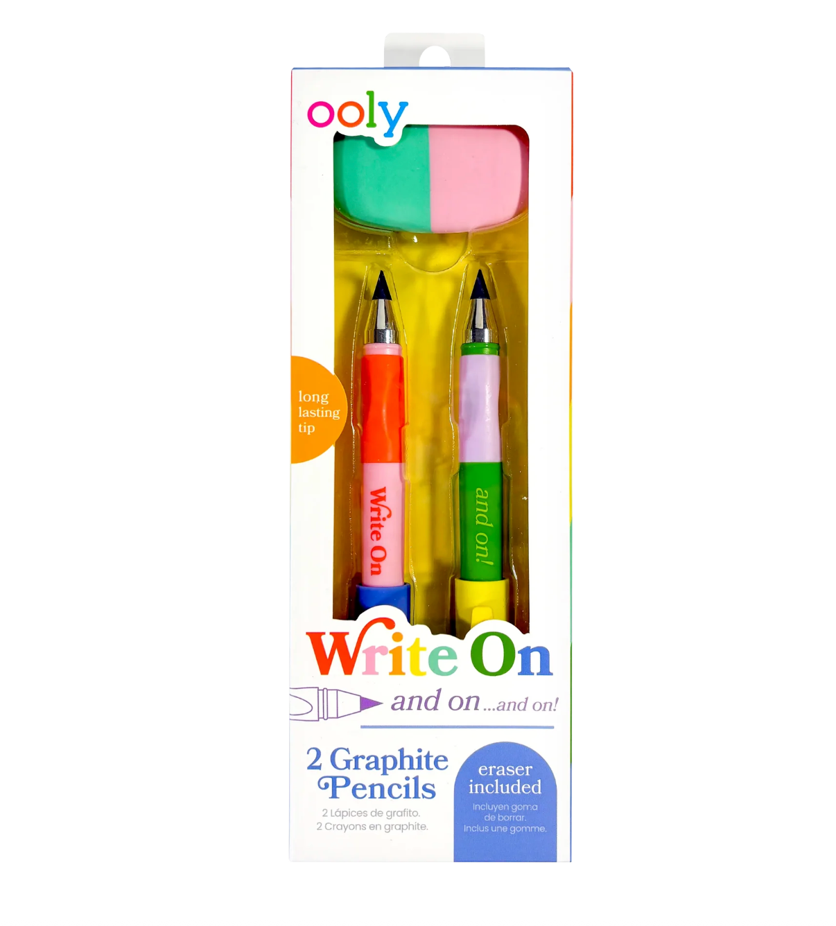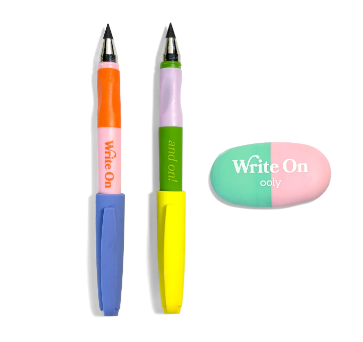 Write On Graphite Pencils (Set of 2) by OOLY: Ready, set, sketch! The Write On Graphite Pencil Set gives a sleek upgrade to your standard pencil pack. Made of solid graphite from tip to tail, these pencils last longer, sharpen cleaner, and deliver a satisfyingly smooth writing experience. With two bold, woodless graphite pencils and one colorful eraser, this 3-piece set is made for big thinkers, tiny doodlers, and everyone in between.